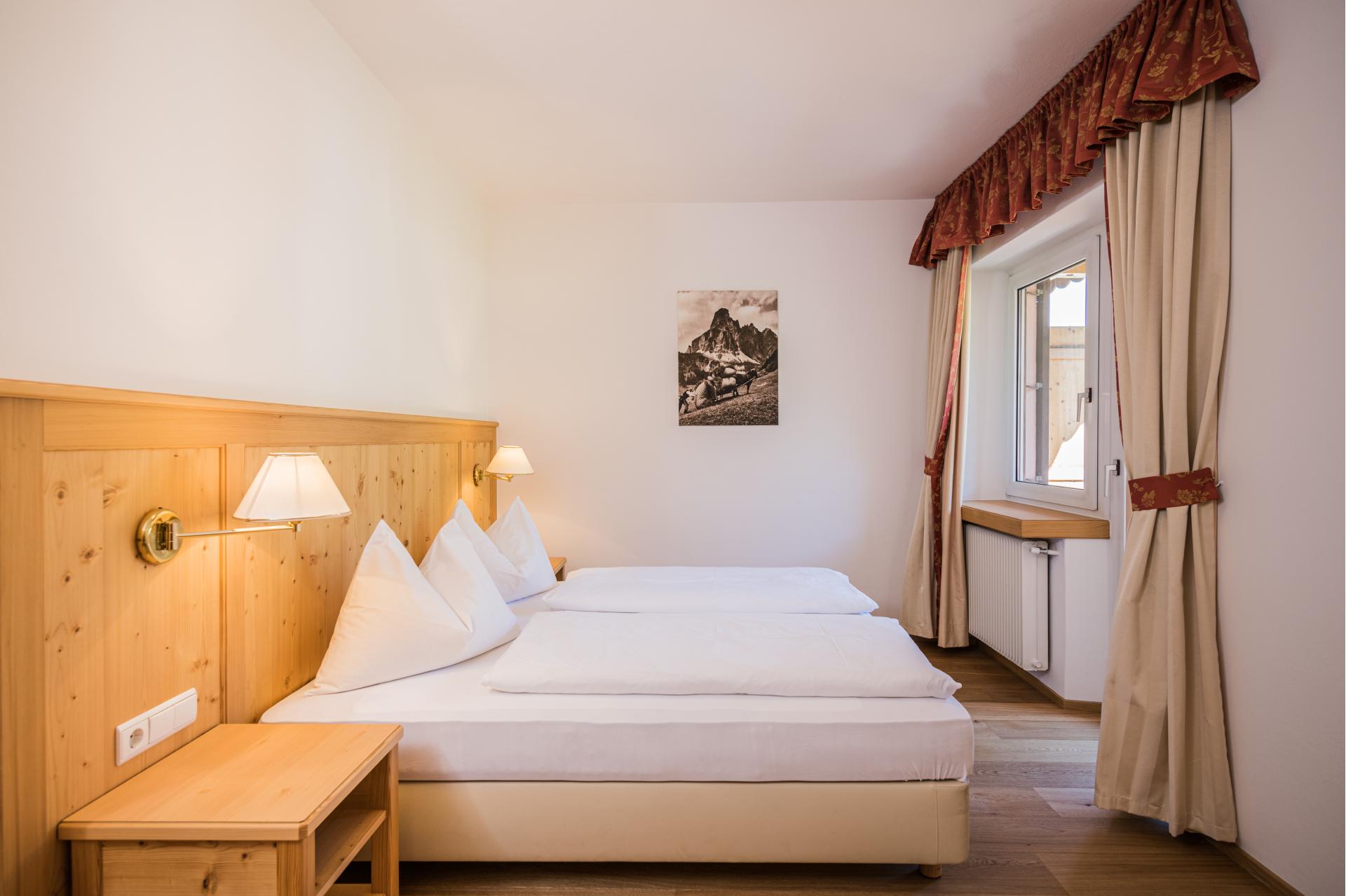 Familienzimmer mit Doppelbett, Ecktisch oder Sitzsessel, Sat-TV, Schreibtisch, Telefon, Safe und Badezimmer mit Dusche, WC, Bidet und Föhn. Vom Balkon blicken Sie auf die Sextner ...