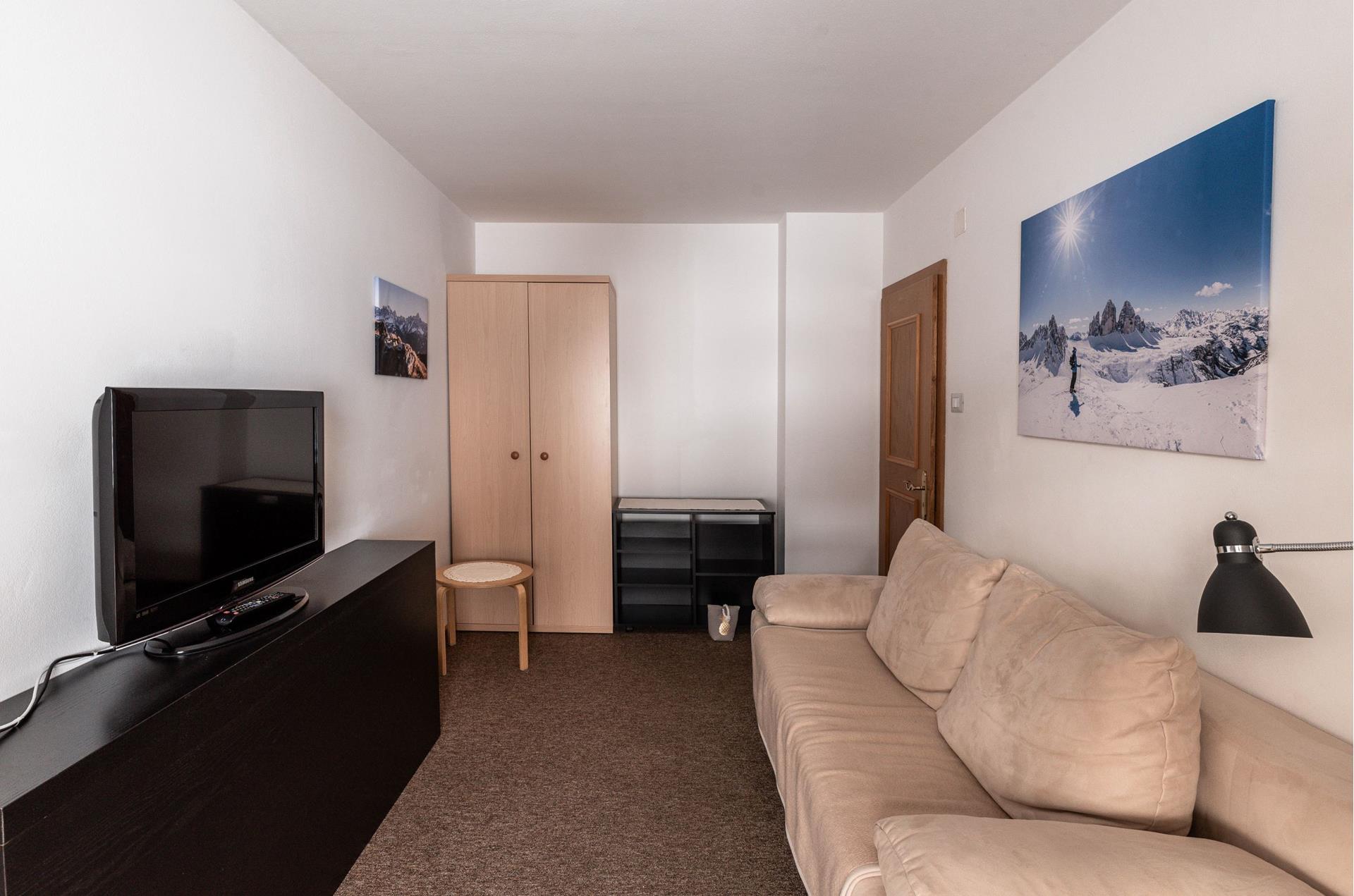 - living room with pull-out sofa bed and TV