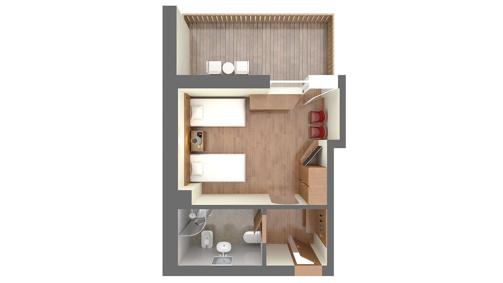 Small double room with balcony and view of the Helm. It is equipped with satellite TV, WiFi, telephone, safe and bathroom with shower, toilet, hairdryer and sometimes with bidet.