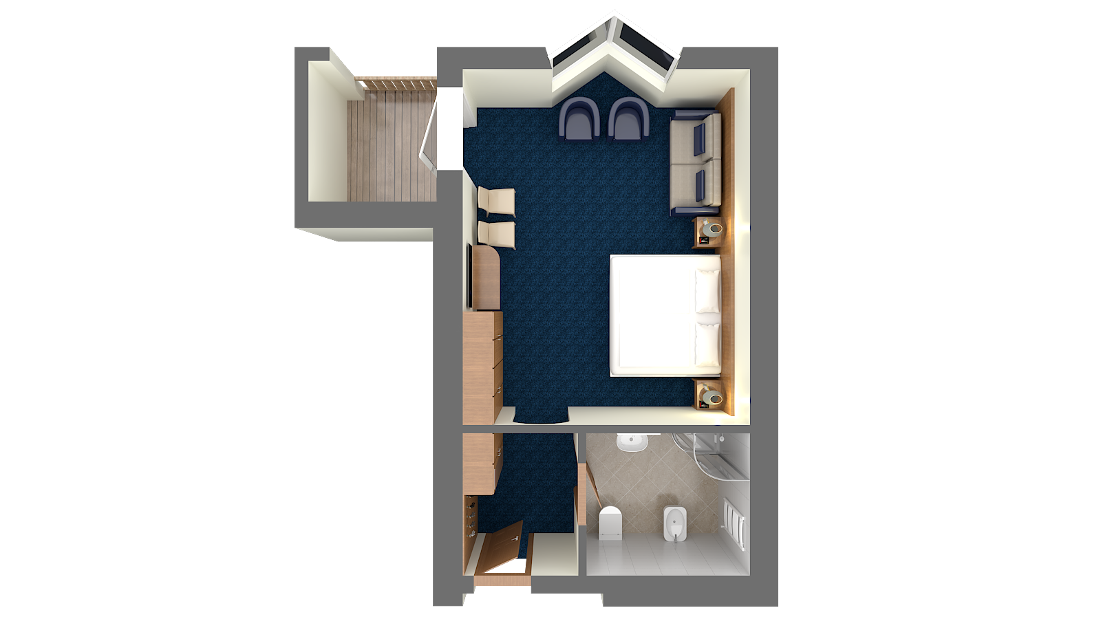 Telephone, satellite television, desk, safe, bathroom, shower/WC, bidet (not in all rooms), hair dryer, balcony with view of the Helm.