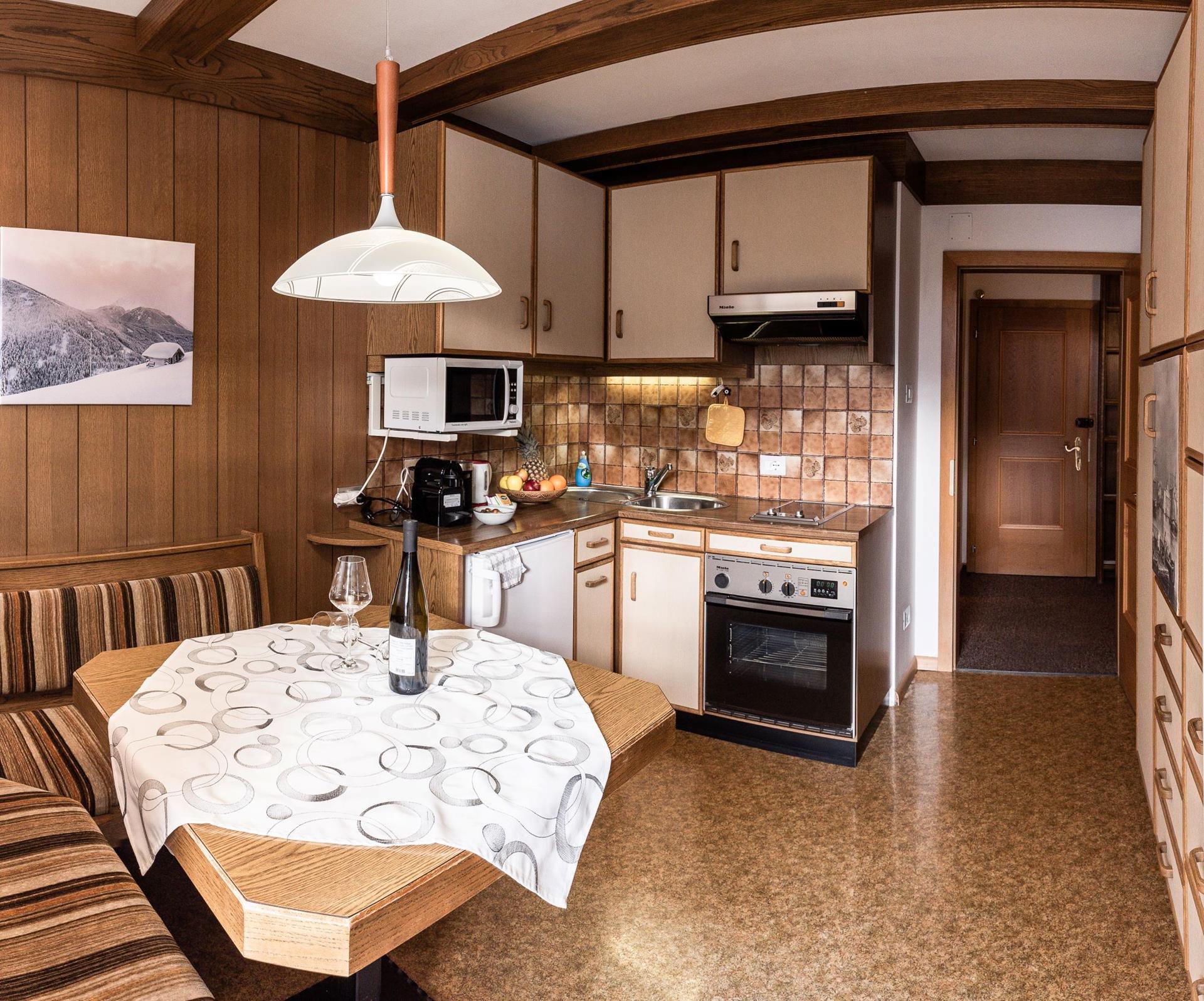 - cucina con fornelli elettrici, microonde, forno e frigorifero con congelatore