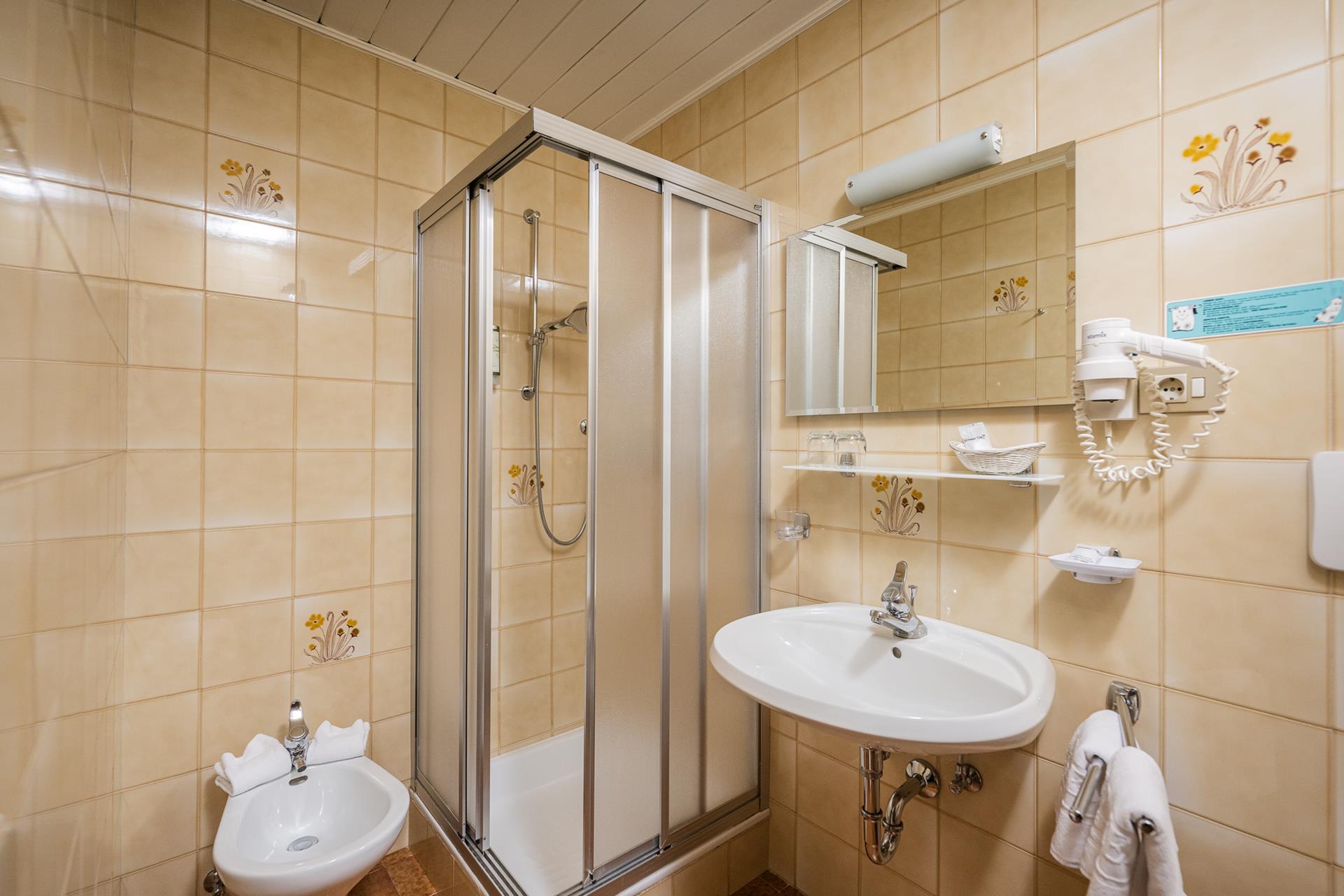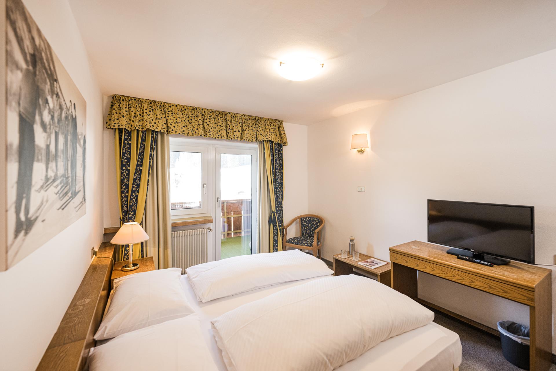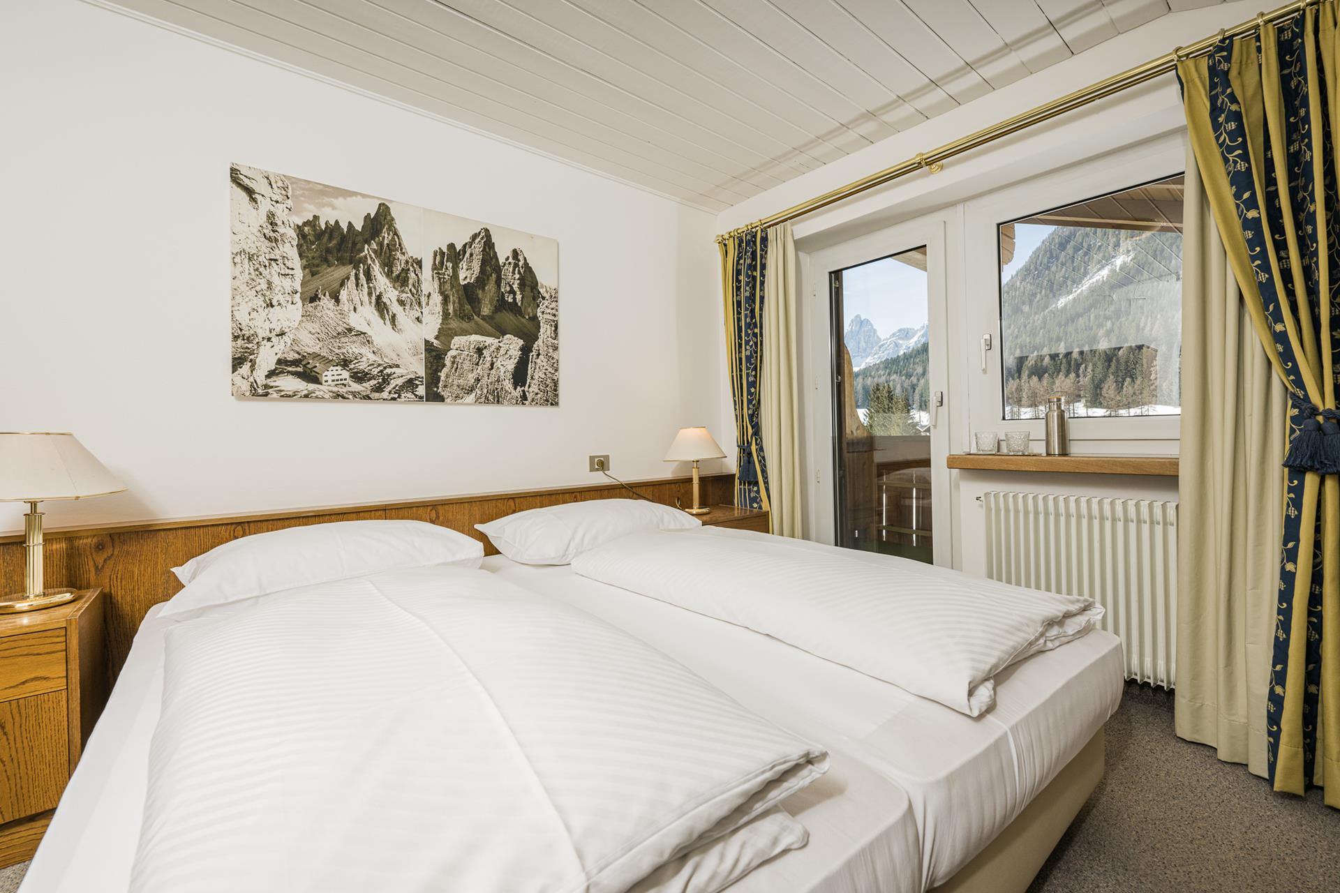 Piccola camera doppia con balcone e vista sulle Dolomiti di Sesto. È dotata di TV satellitare, Wifi, telefono, cassaforte e bagno con doccia, WC, asciugacapelli. Alcune di queste camere sono dotate di bidet.